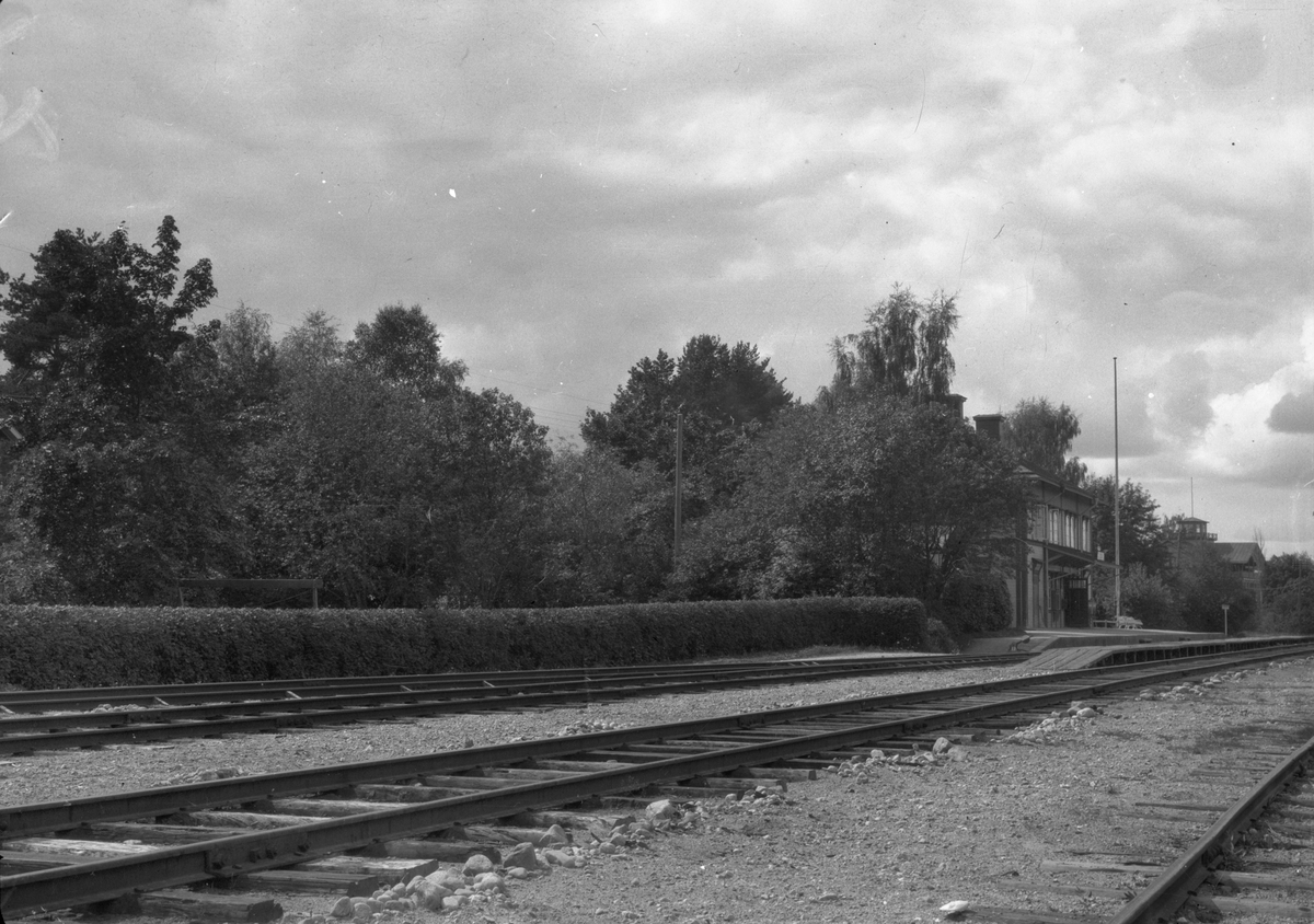 Bangård och trädgård vid Delsbo järnvägsstation. Stationshuset syns till höger i bild. Stationen byggdes av SJ 1888.