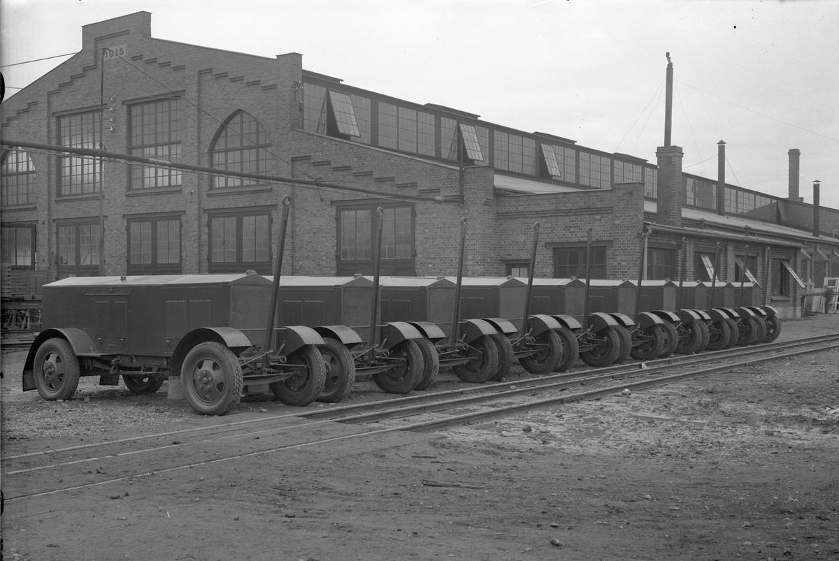 Titel: Maskinvagn m/34. Uppställda på verkstadsgården