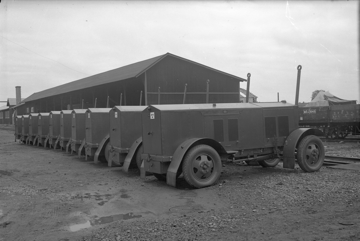 Titel: Maskinvagn m/34. Uppställda på verkstadsgården