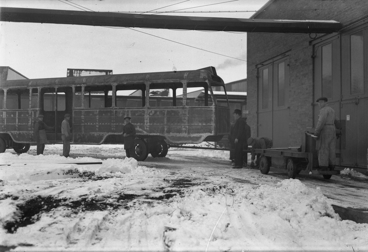 Titel: Transport på gummihjul av spårvagnskorg från avd. P till J