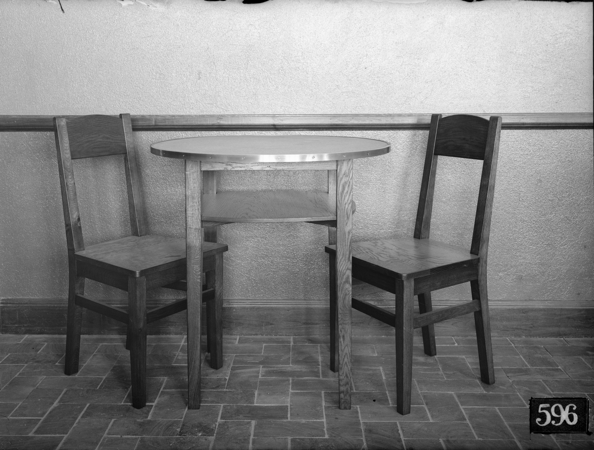 Titel: Bord och två stolar Möbler till Kungl. 1:a Livgrenadjärregementet i Linköping