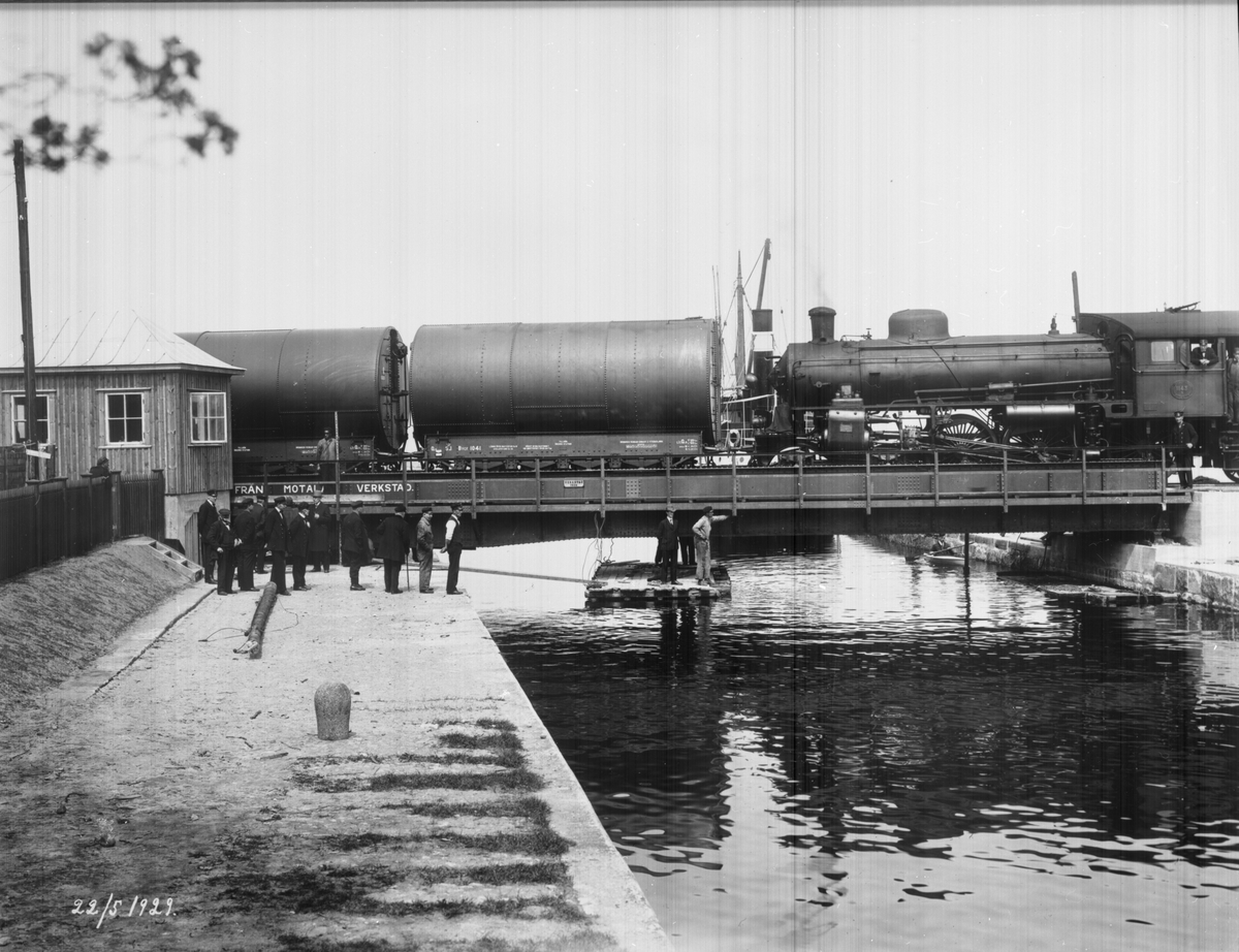 Belastningprov på nya bron. SJ B 1143 med brobelastningsvagnar, SJ Q9 Bycf 1041. Bron tillverkad av Motala Verkstad.