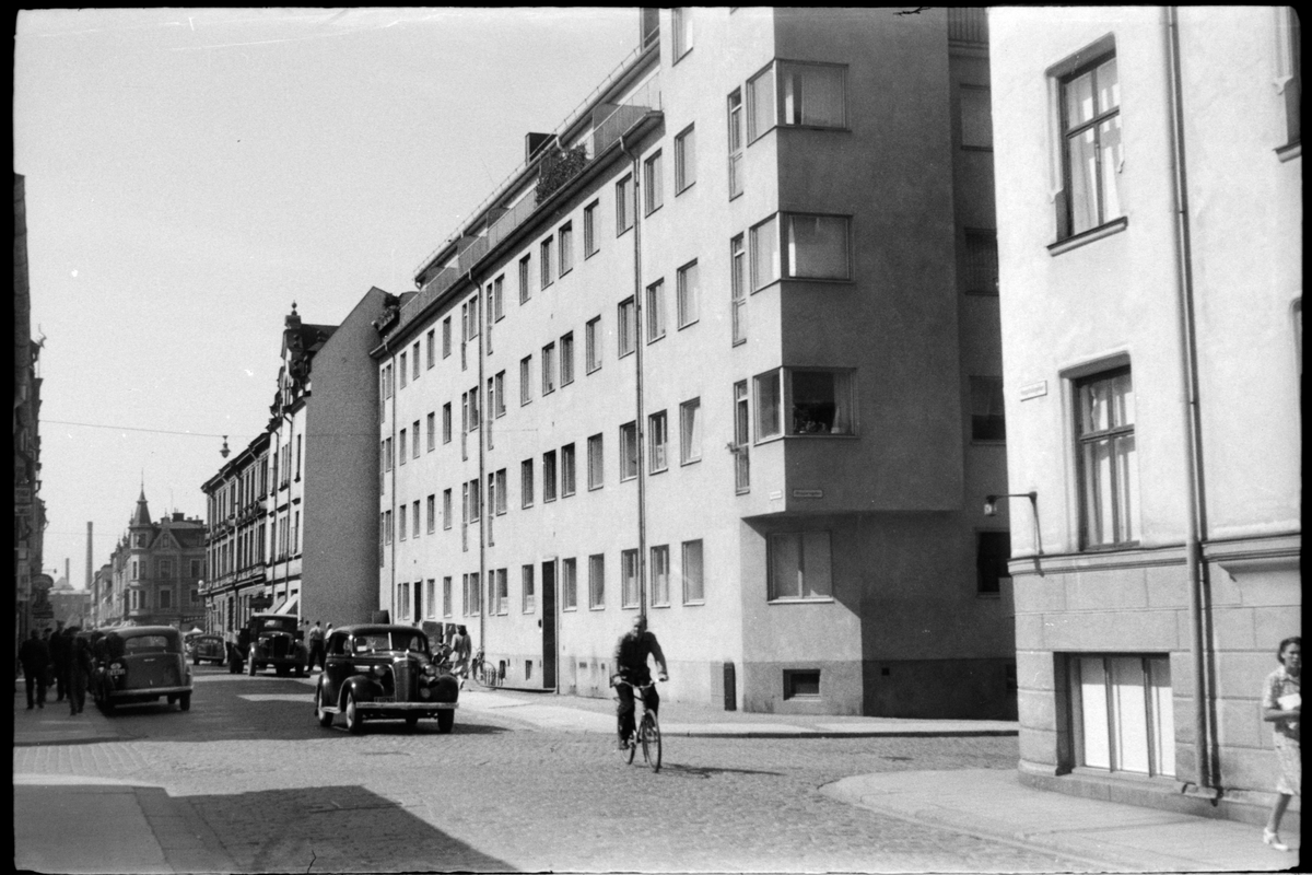 Bil och cyklist på gatstensgata i Norrköping. Cyklisten passerar över Skepparegatan, kvarteret Bakugnen. I bakgrunden syns hörnhuset i kvarteret Svärdet i korsningen med Kristinagatan.