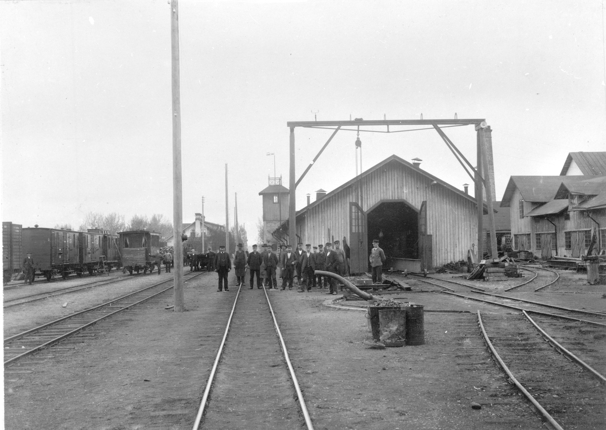 Titel: Järnvägsverkstaden med vattentorn och stationshus i bakgrunden.