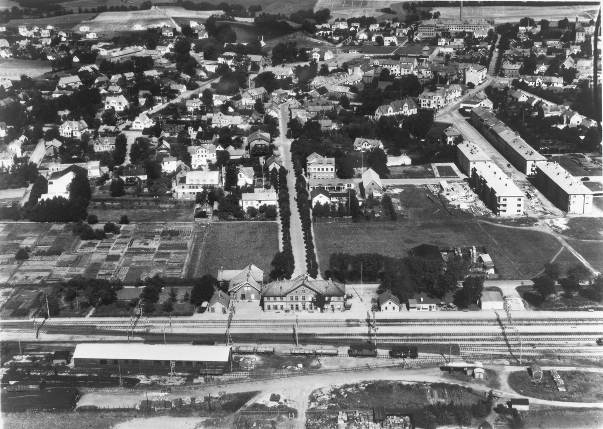 Titel: Flygvy över Klippan med stationområdet i nederkant.