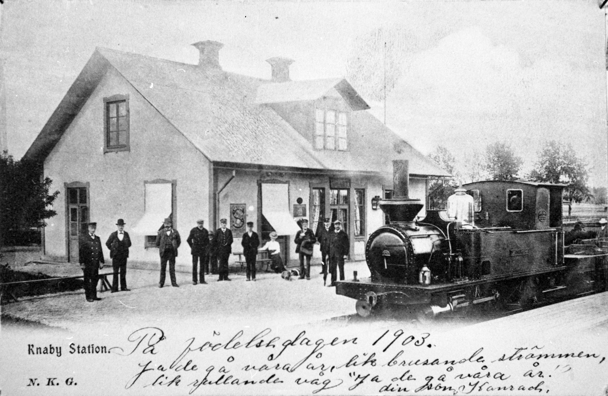Knaby station med Dannemora - Harg Järnväg, DHJ ånglok 4 "Dannemora" vid plattform.