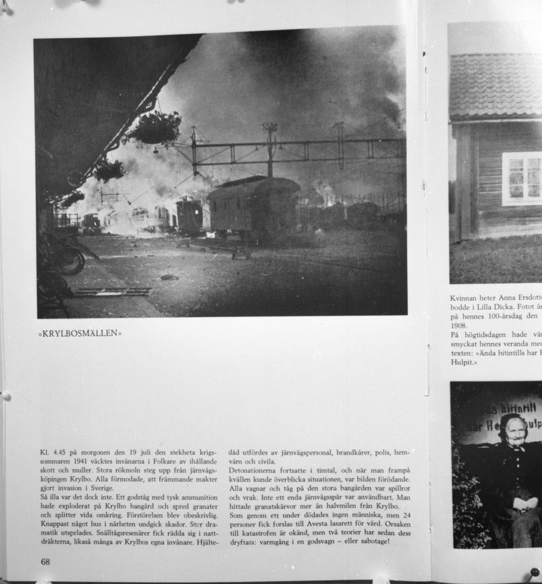 Krylbosmällen. Brinnande personvagnar efter explosionen av ett tyskt ammunitionståg vid Krylbo järnvägsstation den 19 juli 1941.