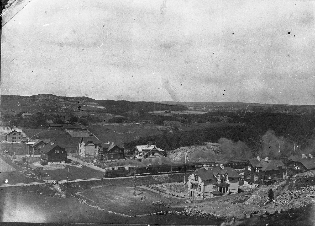 Titel: Vy över järnvägen vid Frölundaborg med omnejd.