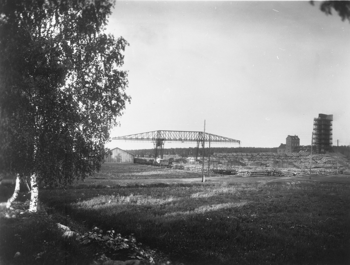 Titel: Hammarby Sulfitfabrik. Massavedsuppplag med brokran