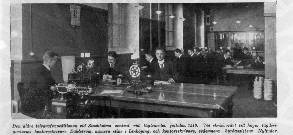 Titel: Telegrafrummet. Vid bordet till höger sitter Kontorsskrivare Dahlström och Kontorsskrivare Nylinder