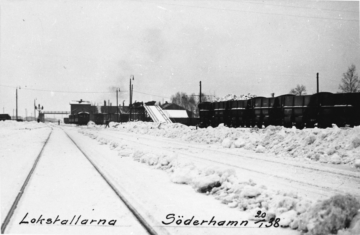 Titel: Lokstall och kolbrygga olch stenkolslastade vagnar.