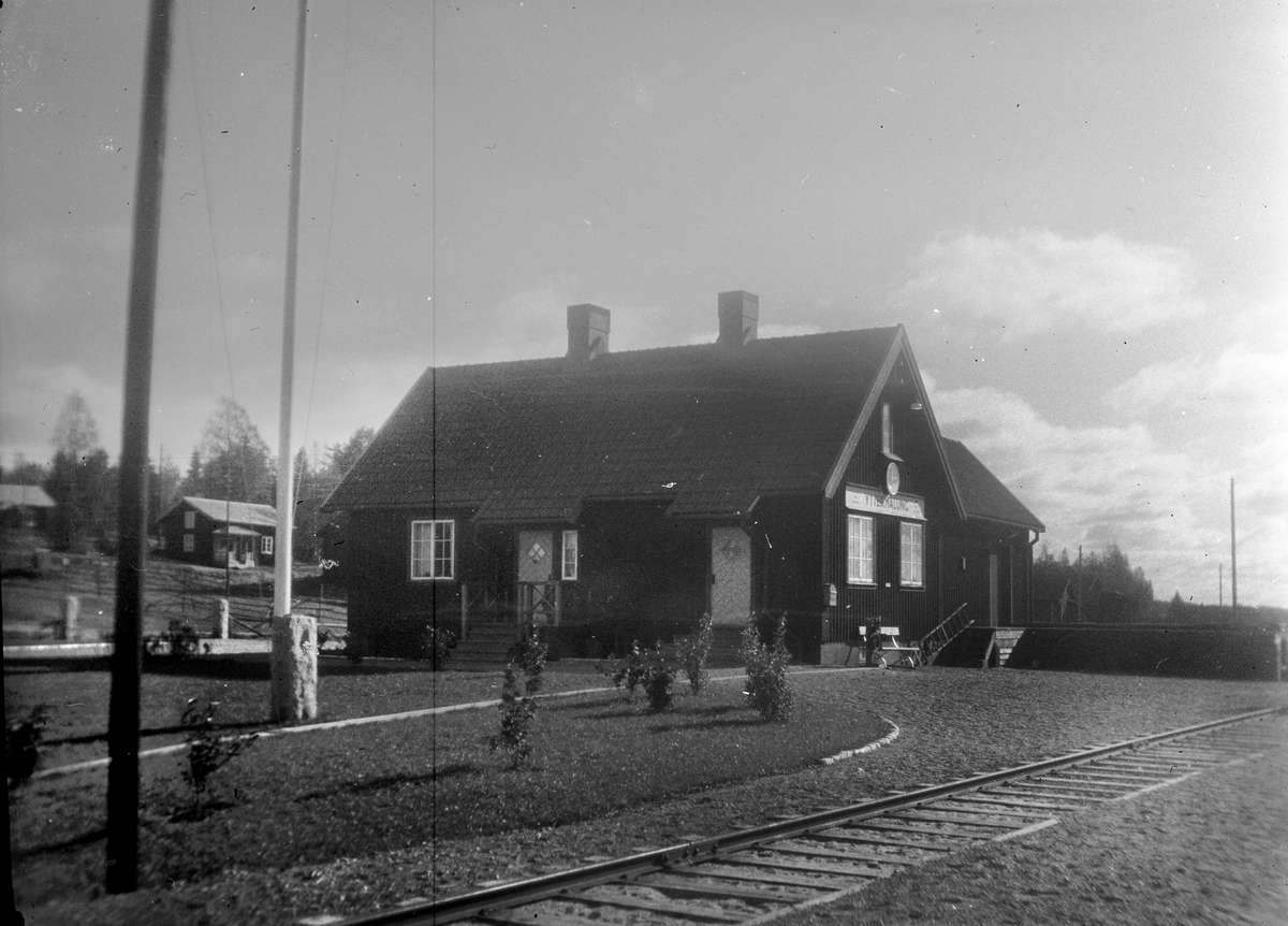 Titel: Hållplats anlagd 1934. Envånings stationshus sammanbyggt med godsmagasinet.