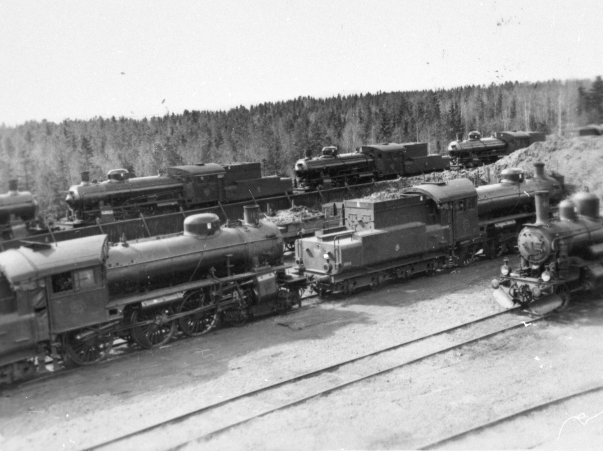 Titel: Ånglok uppställda vid lokstallet. Alla loken utom ett är av typen SJ B.