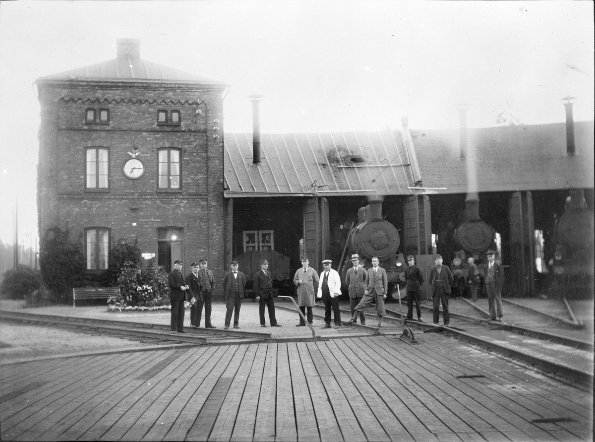 Lokstationen med personal. Lokstall med 22 platser uppfört 1877, utbyggt 1895 och nedlagt som lokstall 1958.