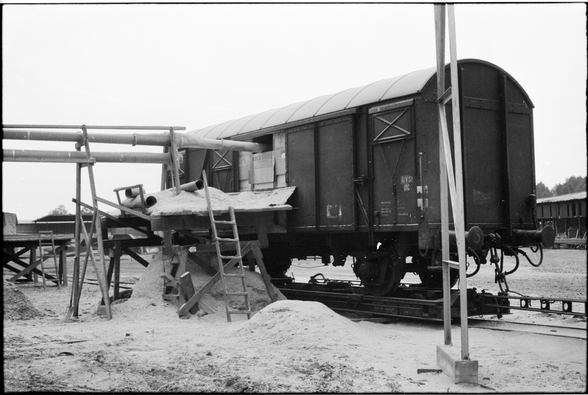 Titel: Lastning av godsvagn vid Myresjöhus industrispår. Godsvagnen står på en överföringsvagn.