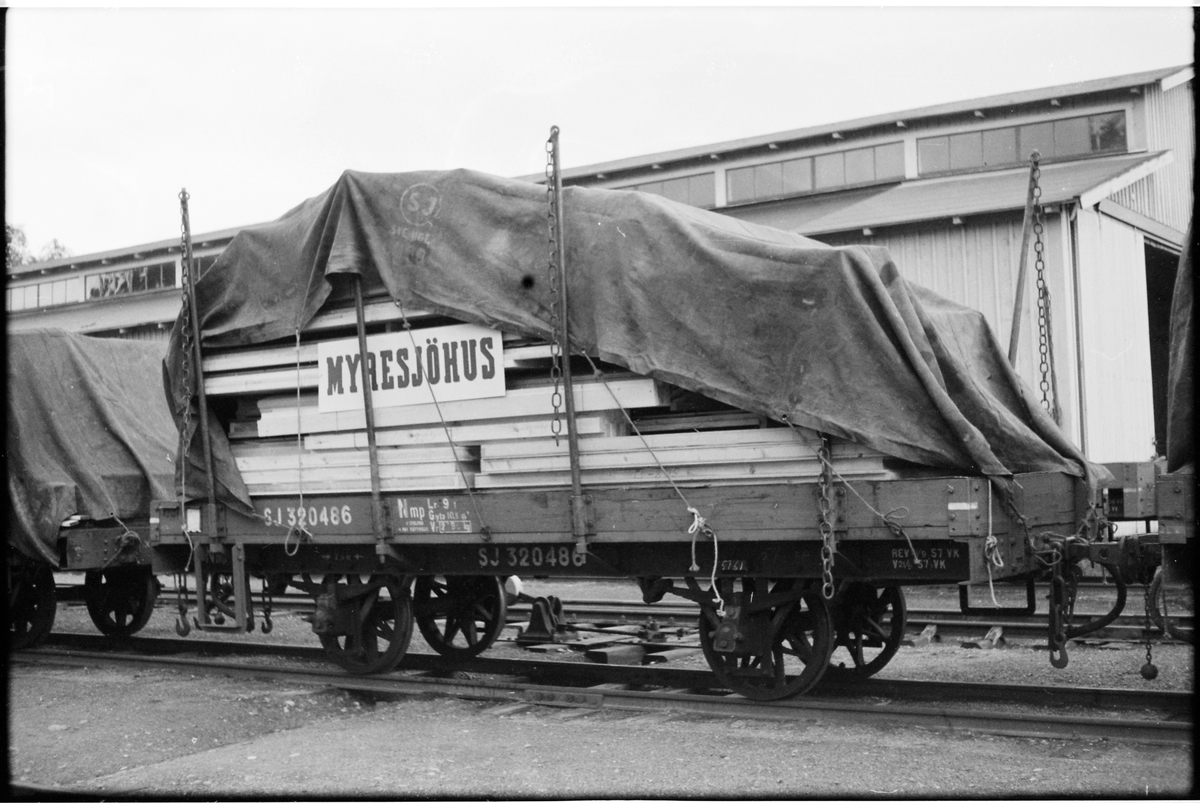 Statens Järnvägar, SJ Nmp 320486, godsvagn lastad med gods för Myresjöhus, här framför godsmagasinen vid Myresjö station.
