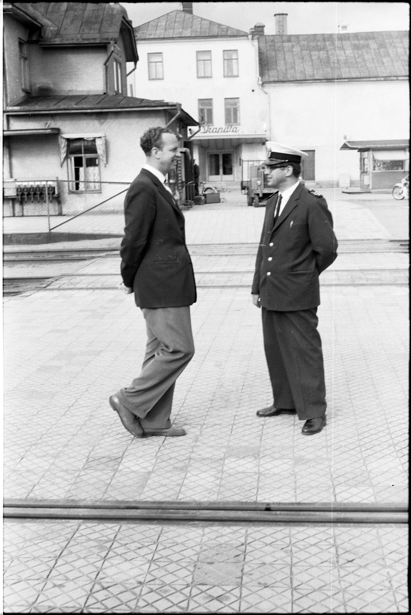 Titel: Man samtalar med stationsinspektor vid Vetlanda station.