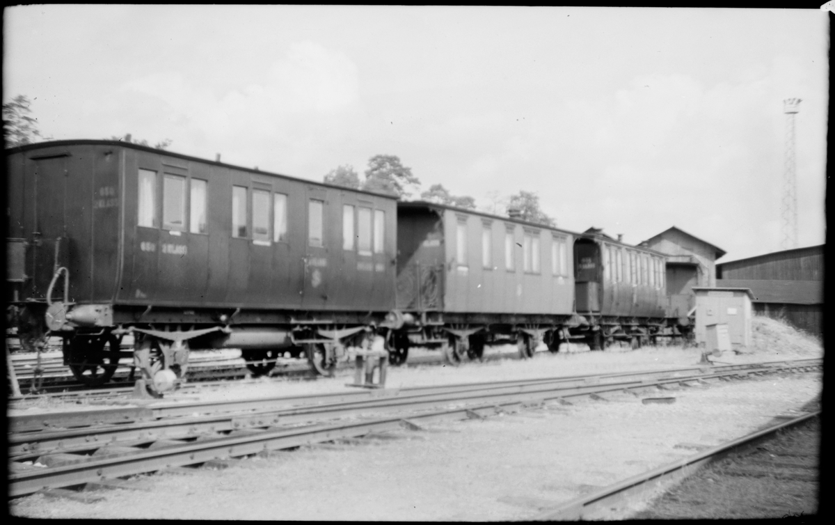 Titel: Tre av järnvägsmuseums personvagnar vid lokalerna i Tomteboda.