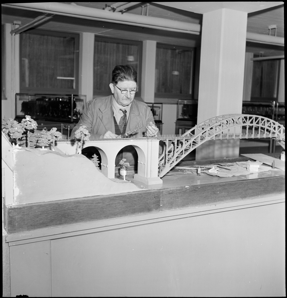 Titel: Uppmontering av modellen av Årstabron i Järnvägsmuseets lokaler på Torsgatan i Stockholm.