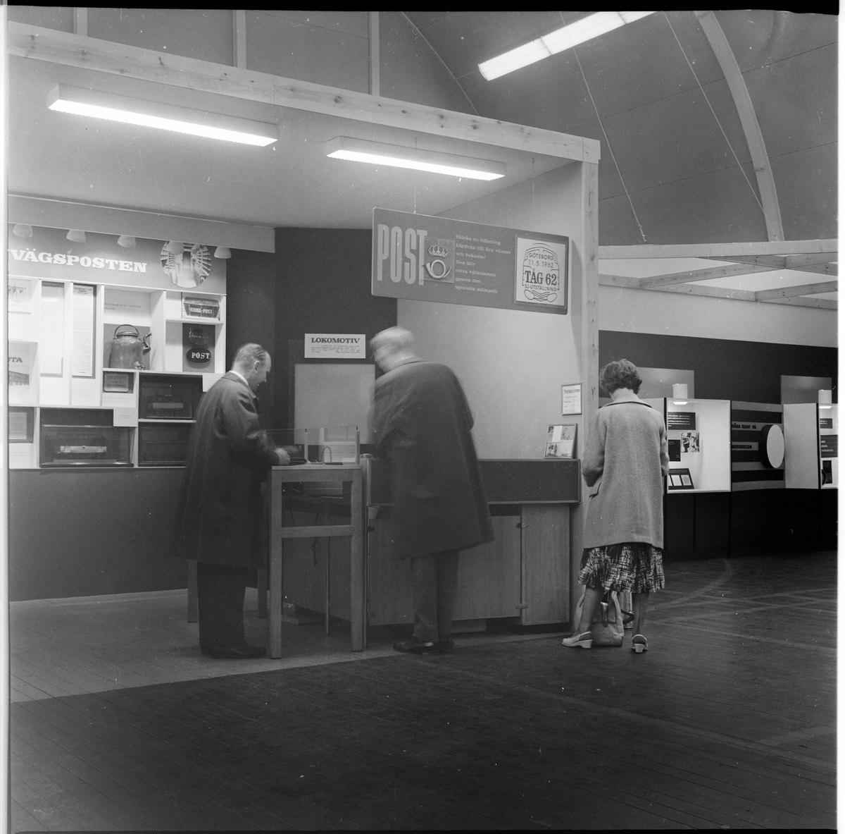 Herrar samt dam som nyttjar postkontoret kopplat till Järnvägsstationen vid utställningen i Göteborg 1962.