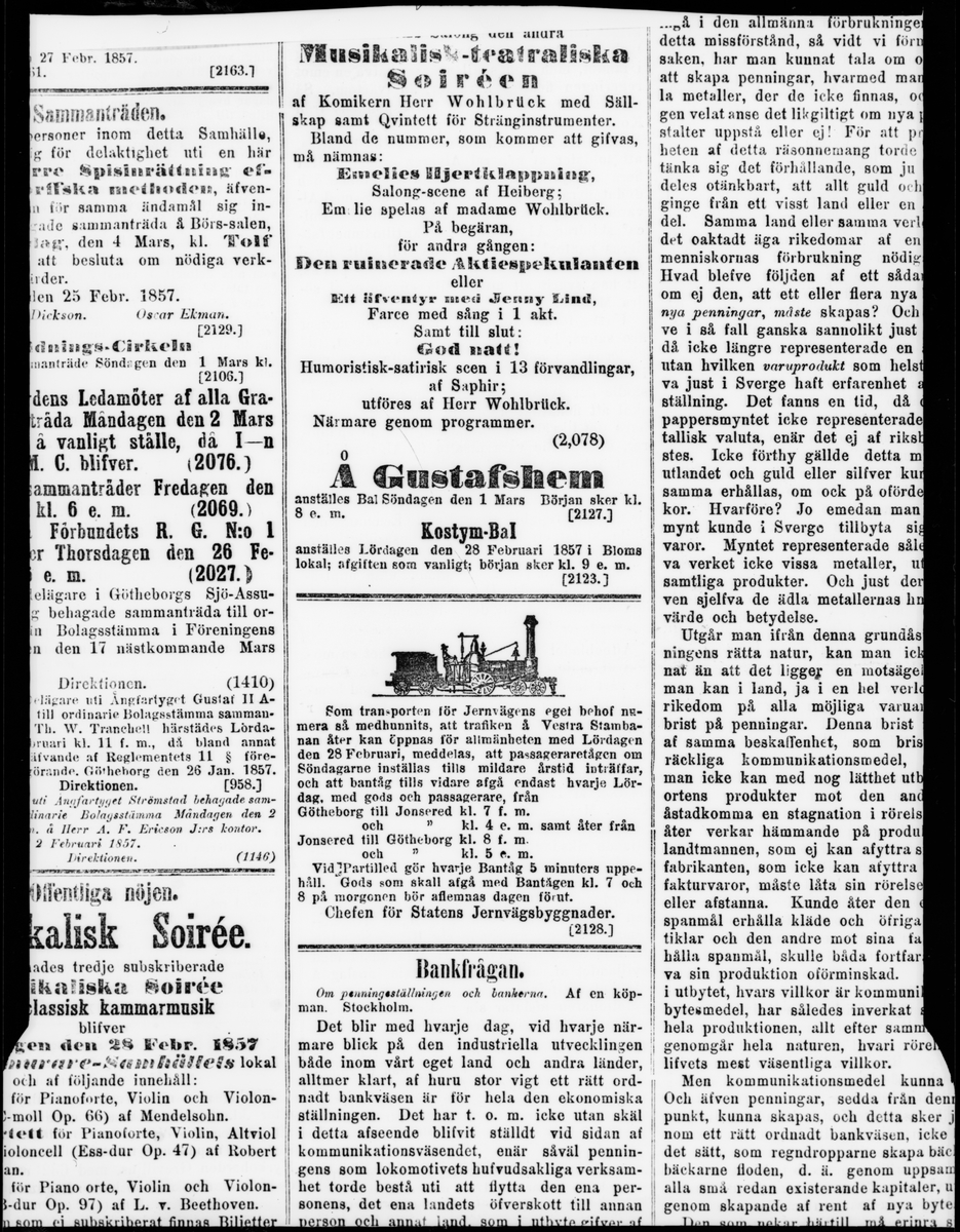 Tidningsklipp från 1857-02-27 gällande återupptagen persontrafik på Västra Stambanan mellan Göteborg och Jonsered.