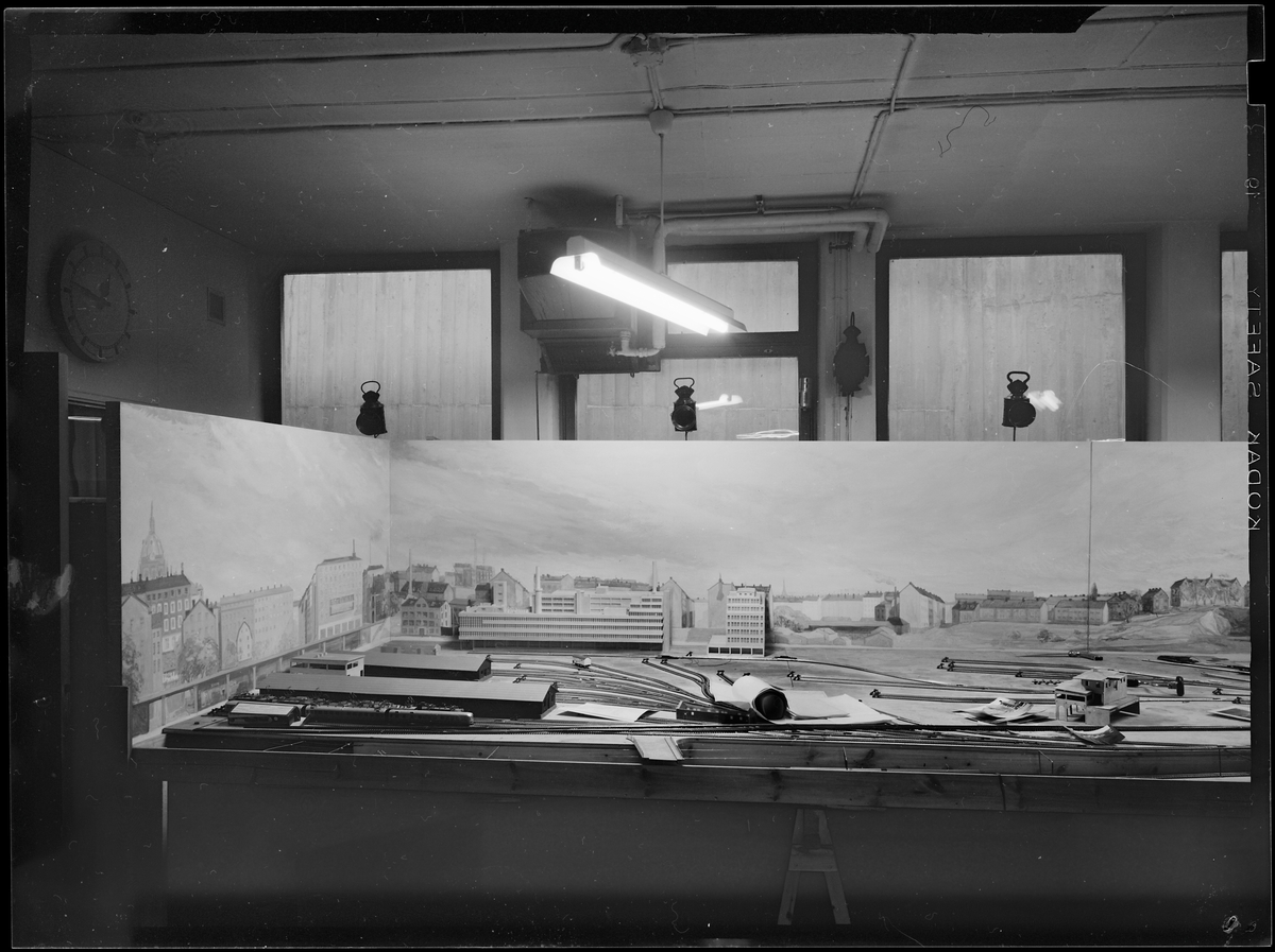 Del av elektrisk järnvägsmodell, föreställande Stockholm Södra - Älvsjö.