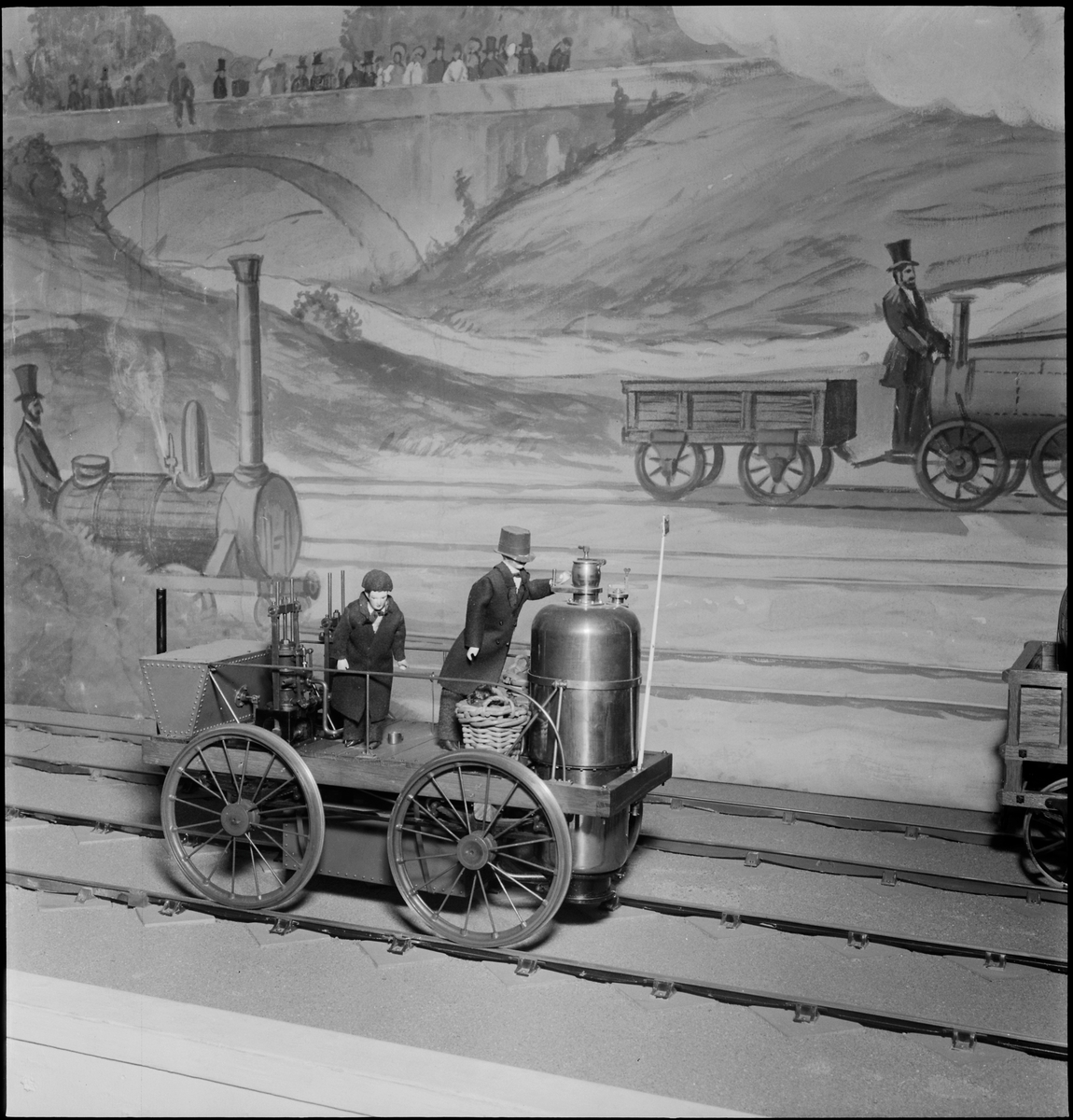 Titel: Modell av Novelty framför målning föreställande Rainhall.