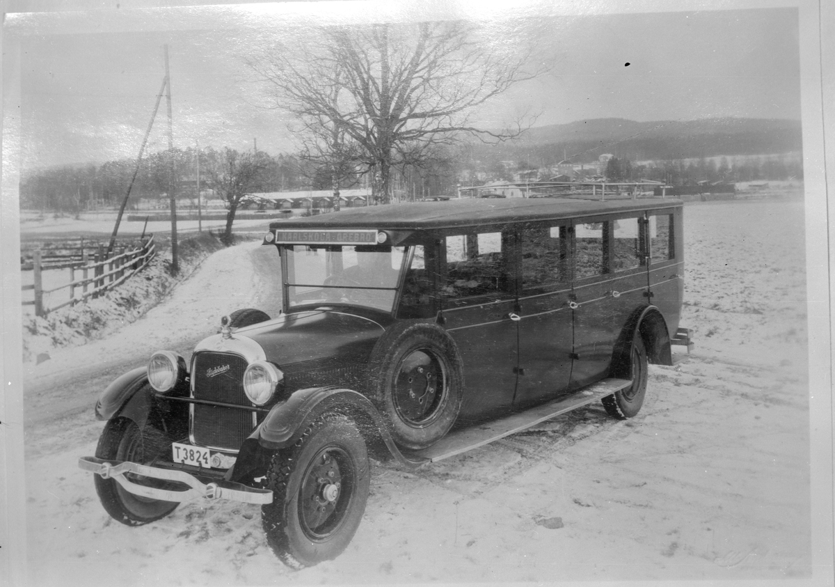 Buss T 3824, fabrikat Studebaker, från 1924. Bussen inköptes nämnda år av trafikutövaren A G Andersson med linje Karlskoga - Örebro. I december 1928 köpte Nora Bergslags Järnväg, NBJ, in Anderssons företag med bussar och allt.