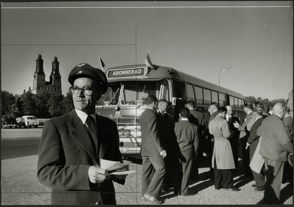 Trafikaktiebolaget Grängesberg - Oxelösunds Järnvägar, TGOJ personal och buss i Eskilstuna. I bakgrunden Klosters kyrka.