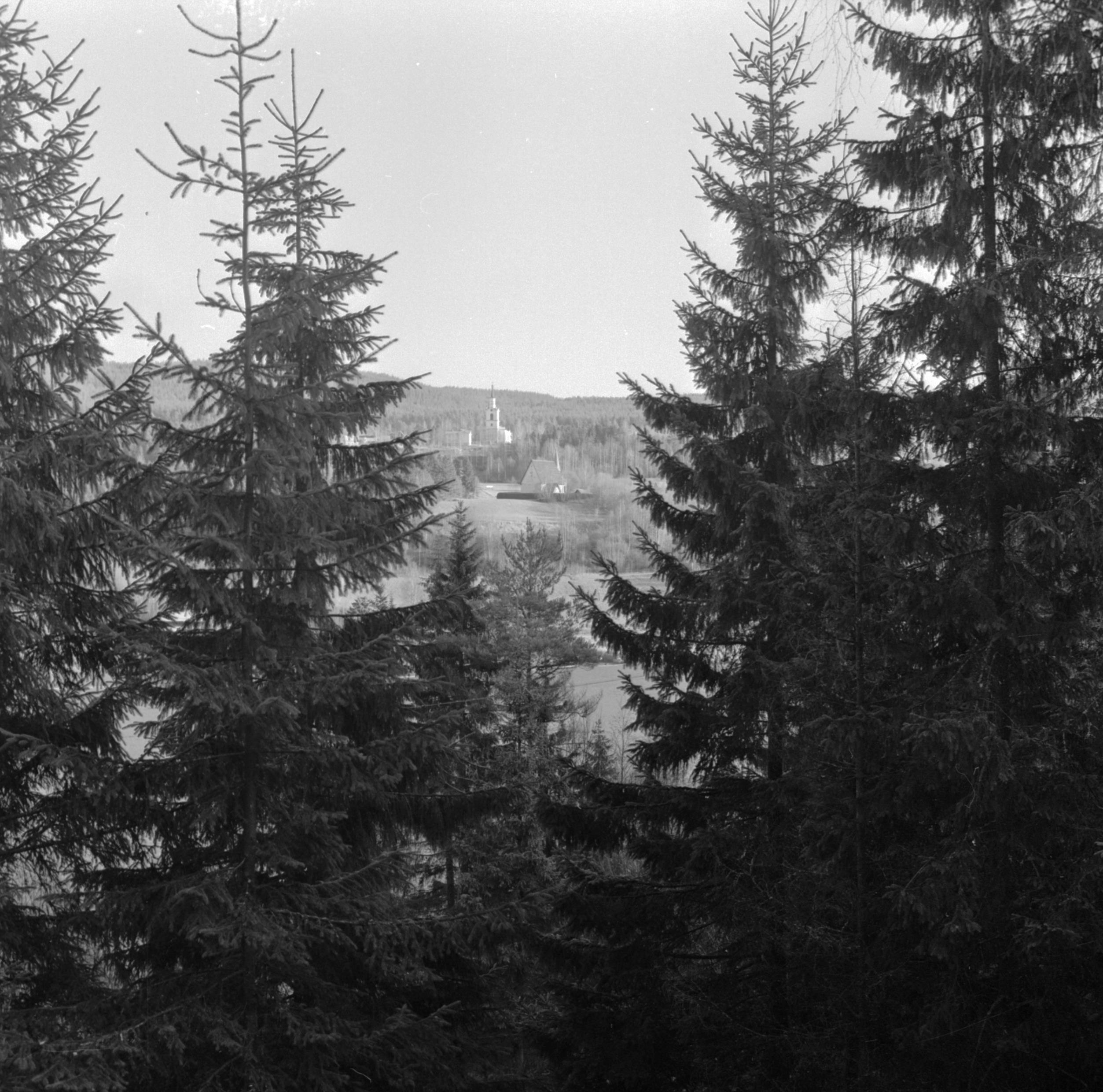 Kyrkan på håll med den nya kyrkan i bakgrunden.