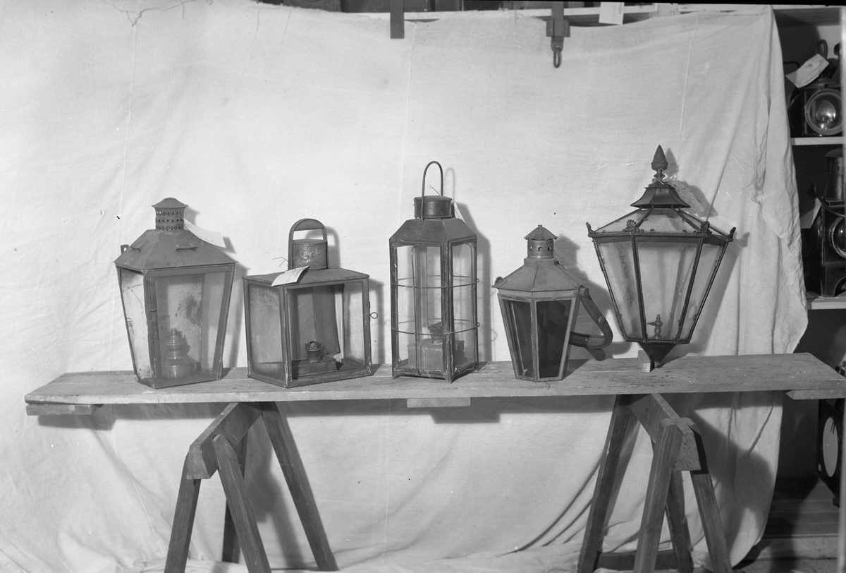 Div lyktor; Järnvägsmuseet. Plattformslykta fr NBJ Ark nr 5325 Plattformslykta fr NBJ Ark nr 5326 Lykta för pumphus Ark nr 5419 Brandlykta Ark nr 5150 Plattformslykta för gas Ark nr 5116