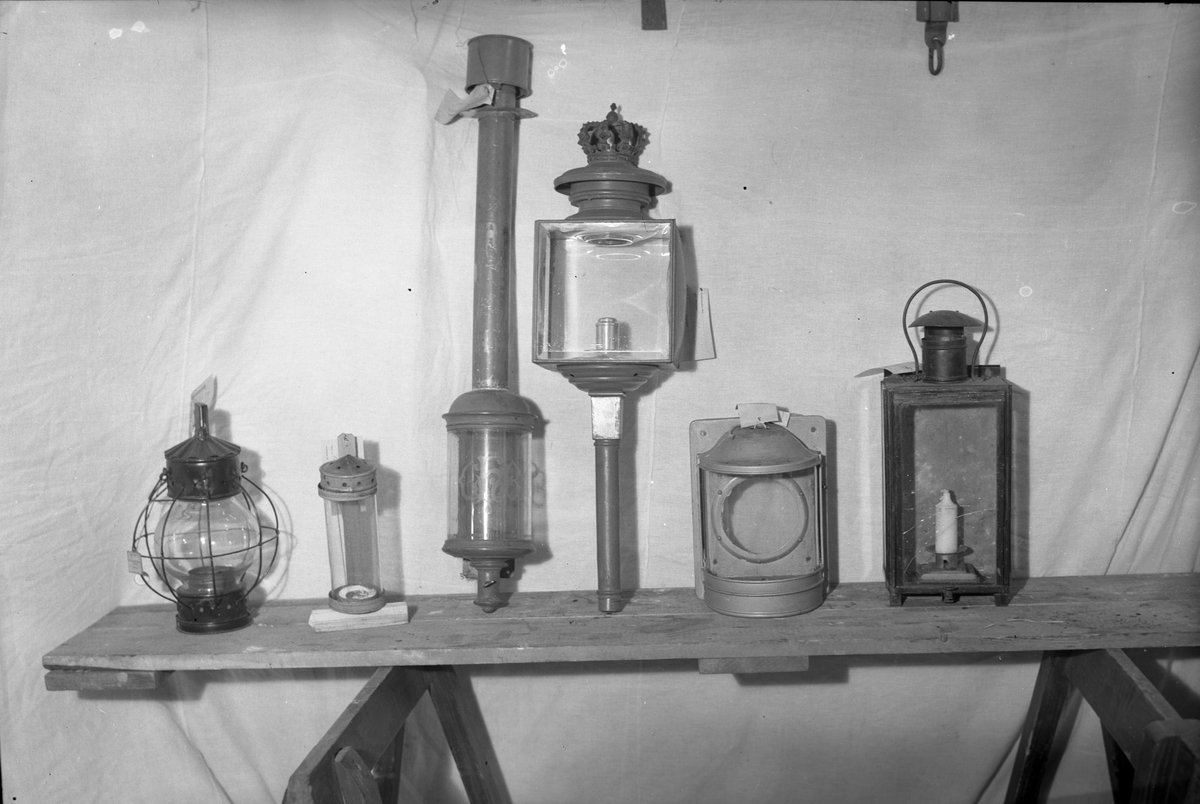 Div lyktor; Järnvägsmuseet. Vagnslykta kupol för hästvagn ark nr 1301 Vägglykta fr sjukvagn VKB ark nr 1333 Vägglykta fr sjukvagn VKB ark nr 1611 Lykta fr Carl XV:s vagn ark nr - Lykta kupé fr NrSlJ ark nr 5579 Vagnslykta ark nr -