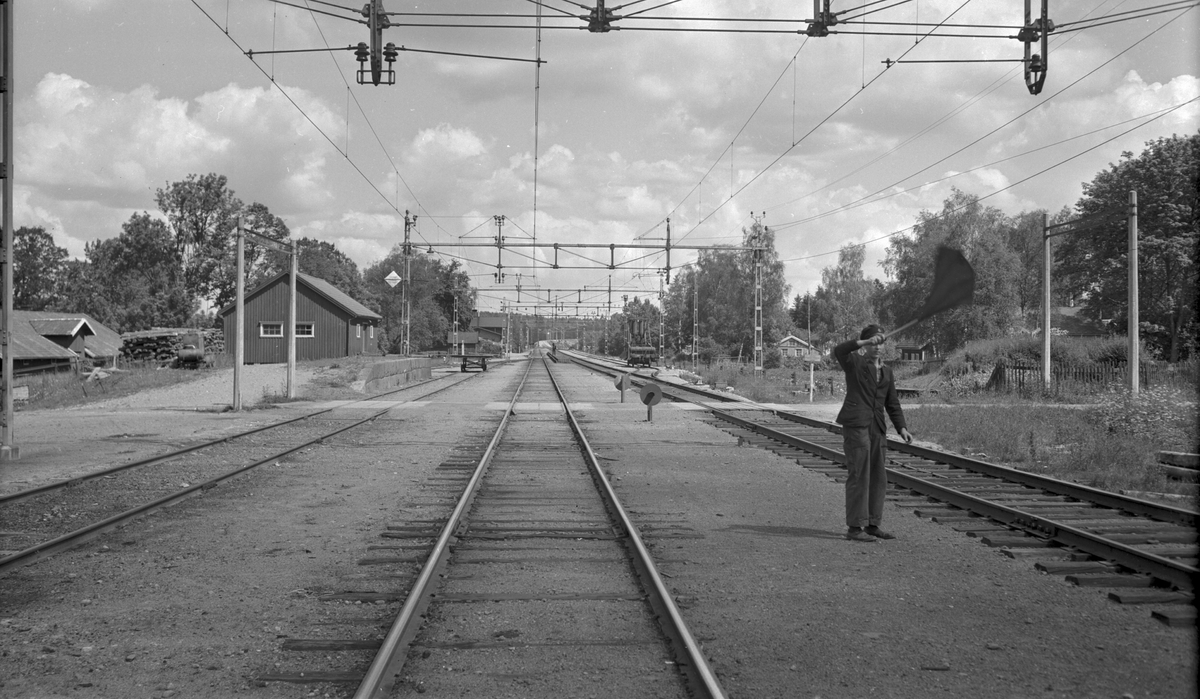 Statens Järnvägar, SJ säkerhetstjänst. Stinsen gör en signal med flagan.