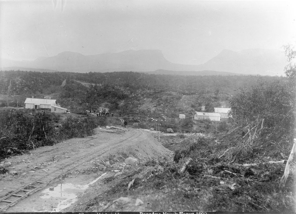 Titel: Riksgränsbanan byggs. Lapporten tonar upp sig i bakgrunden