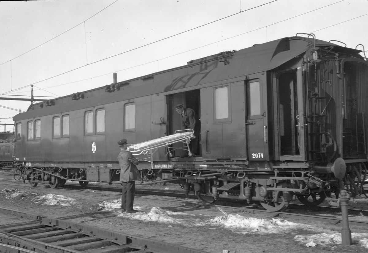 Statens Järnvägar, SJ Bo10 2074 Ombordlastning av säng i Sjukvagn