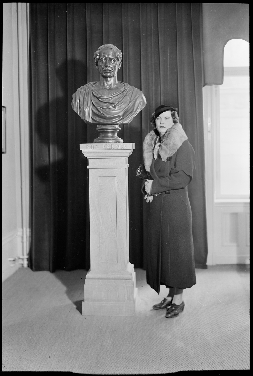 Titel: Fru A. Östberg vid byst av Nils Ericson.