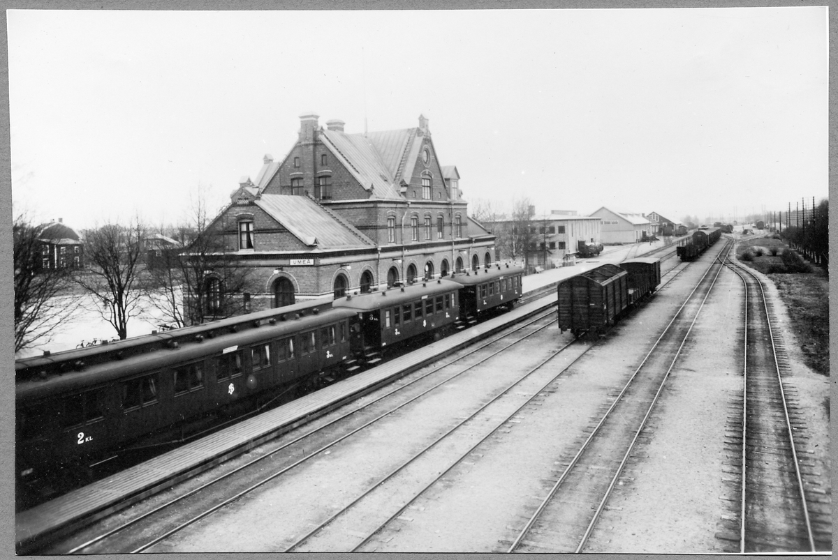 Titel: Umeå station. Klockan är 13.43 och tågsättet till persontåg Pt 2774 med avg 13.52 växlas samman. J-loket växlar en SJ F1 i bakgrunden och övriga vagnar i tåget blir SJ C3e 2536, C3d 2178, BCo4 1737 samt en DF5.