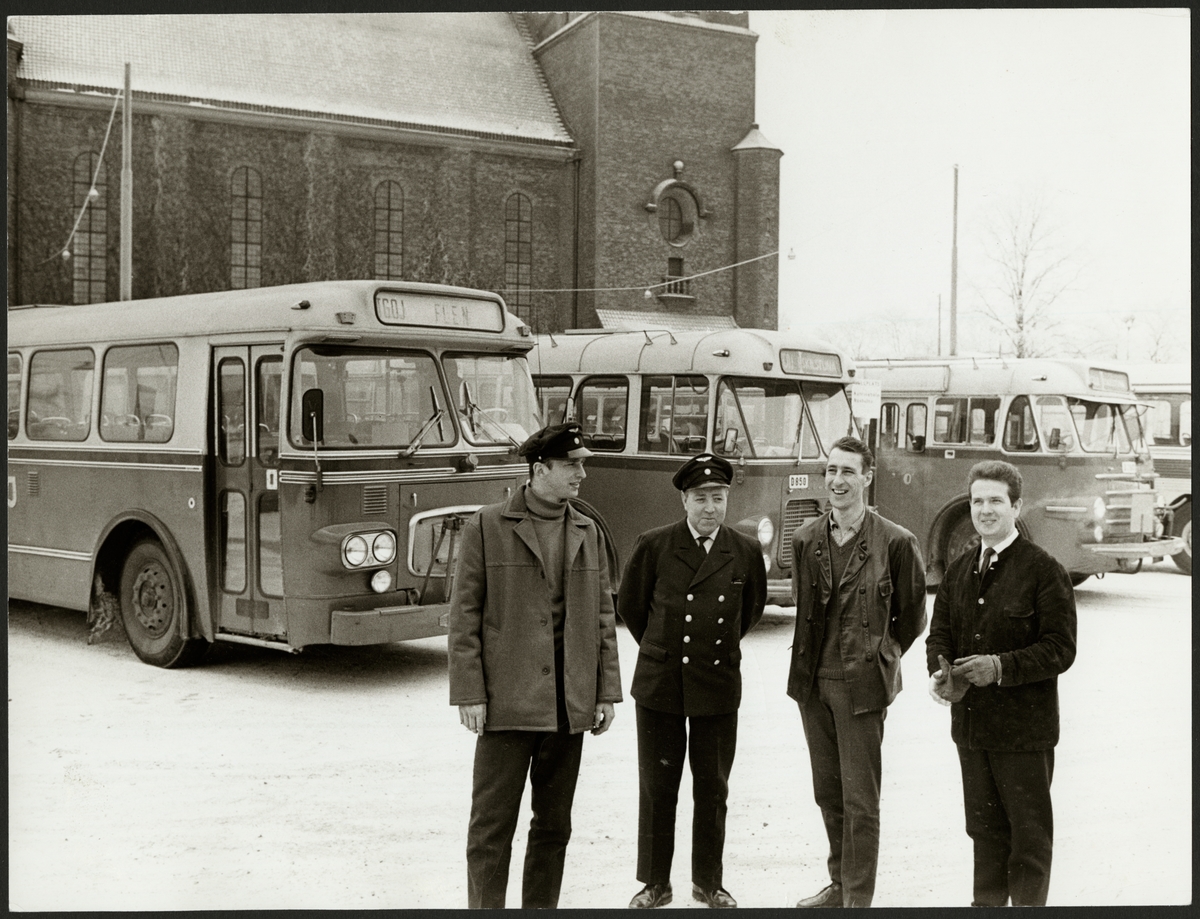 Trafikaktiebolaget Grängesberg - Oxelösunds Järnvägar, TGOJ bussar och personal vid Klosters kyrka i Eskilstuna. Från vänster: Lars-Erik Johansson från Kungsör, Sigvard Pettersson från Flen, Ingvar Pettersson och Bernt Filipsson från Eskilstuna.