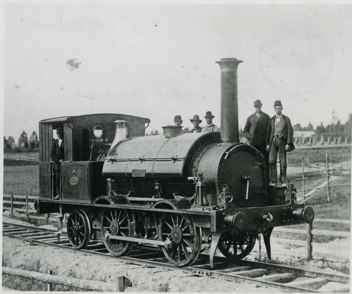 Sadeltankloket på bilden är (vid tiden för fotot) SJB 3, "Bore" (Statens Järnvägsbyggnads lok nr:3), Tillverkat av Beyer (England) 1865.