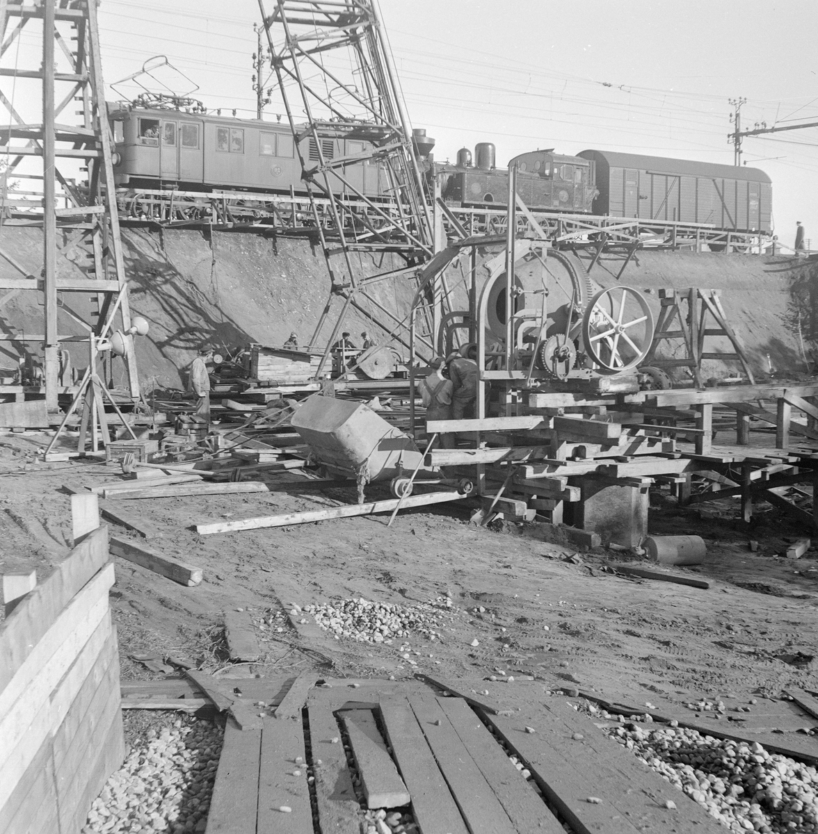 Statens Järnvägar, SJ D och N utmed linjen. Vägportsarbete vid Skövde.