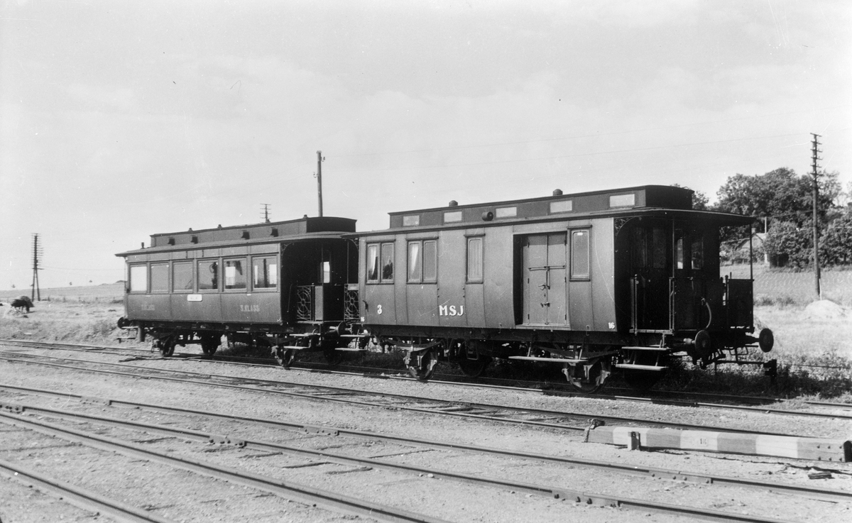 Tvåaxliga vagnar tillhörandes Malmö - Simrishamns Järnväg. En sittvagn, en kombinerad sitt och resgods- eller postvagn. De är 1800-tals vagnar.