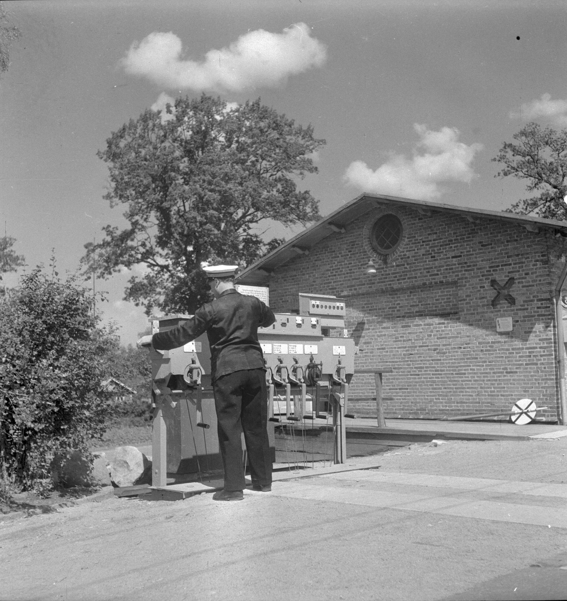 Statens Järnvägar, SJ säkerhetstjänst. Stationsinsmästare med vevställverk vid Fåglavik station.