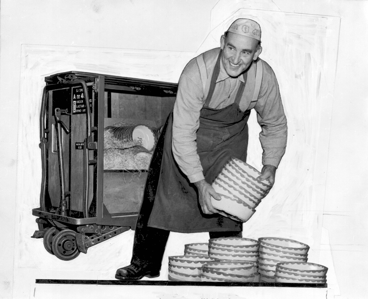 Bild av porslinspackning i SJ småbehållare för frakt från dörr till dörr, Gustafsberg.