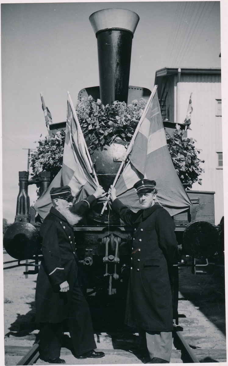 Kristianstad - Hässleholms Järnväg, CHJ Lok 2 Carl XV i autentisk samma utstyrsel från kungamötet 1865. Mannen till vänster konduktör I.Holmgren,till höger Eldare K.Fast.