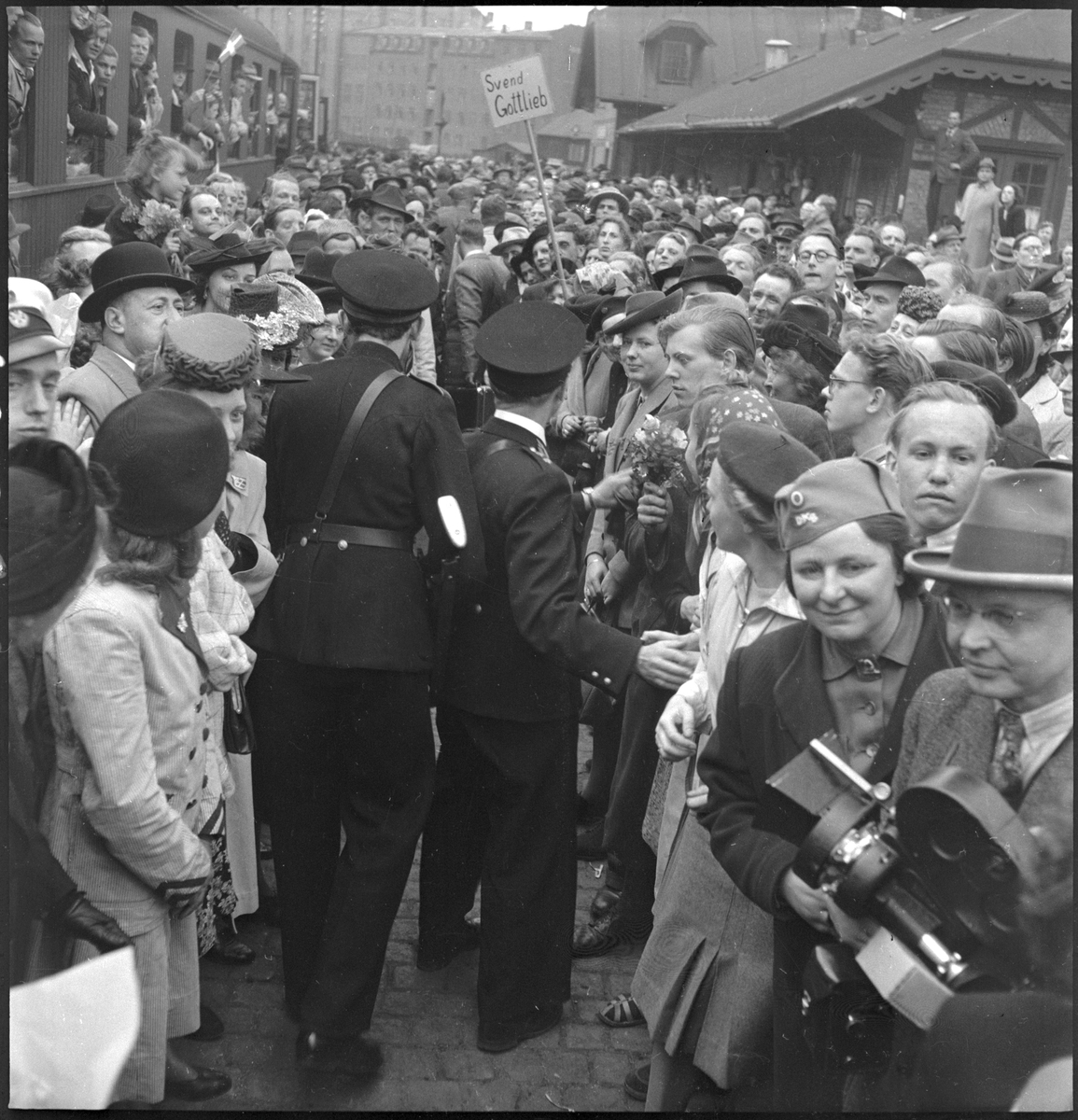 Polisen passerar genom klungan av anhöriga som väntar på ankomsten av de hemvändande flyktingarna. Köpenhamns frihamn. Skylt med text: Svend Gottlieb.
