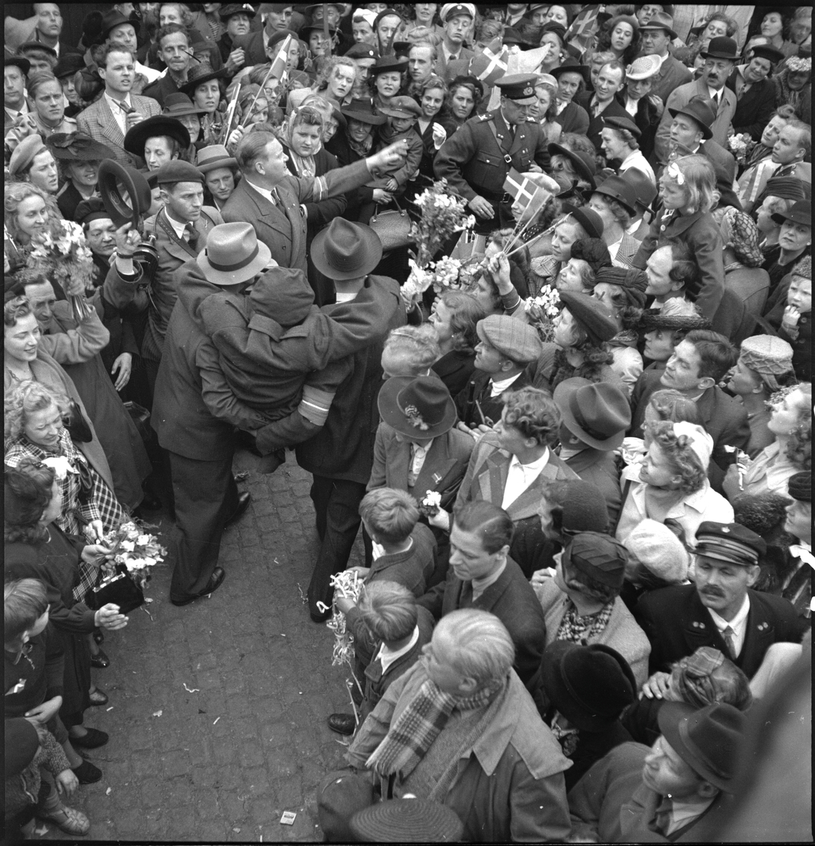 En av flyktingarna, troligen skadad, bärs här genom den väntande folkmassan.