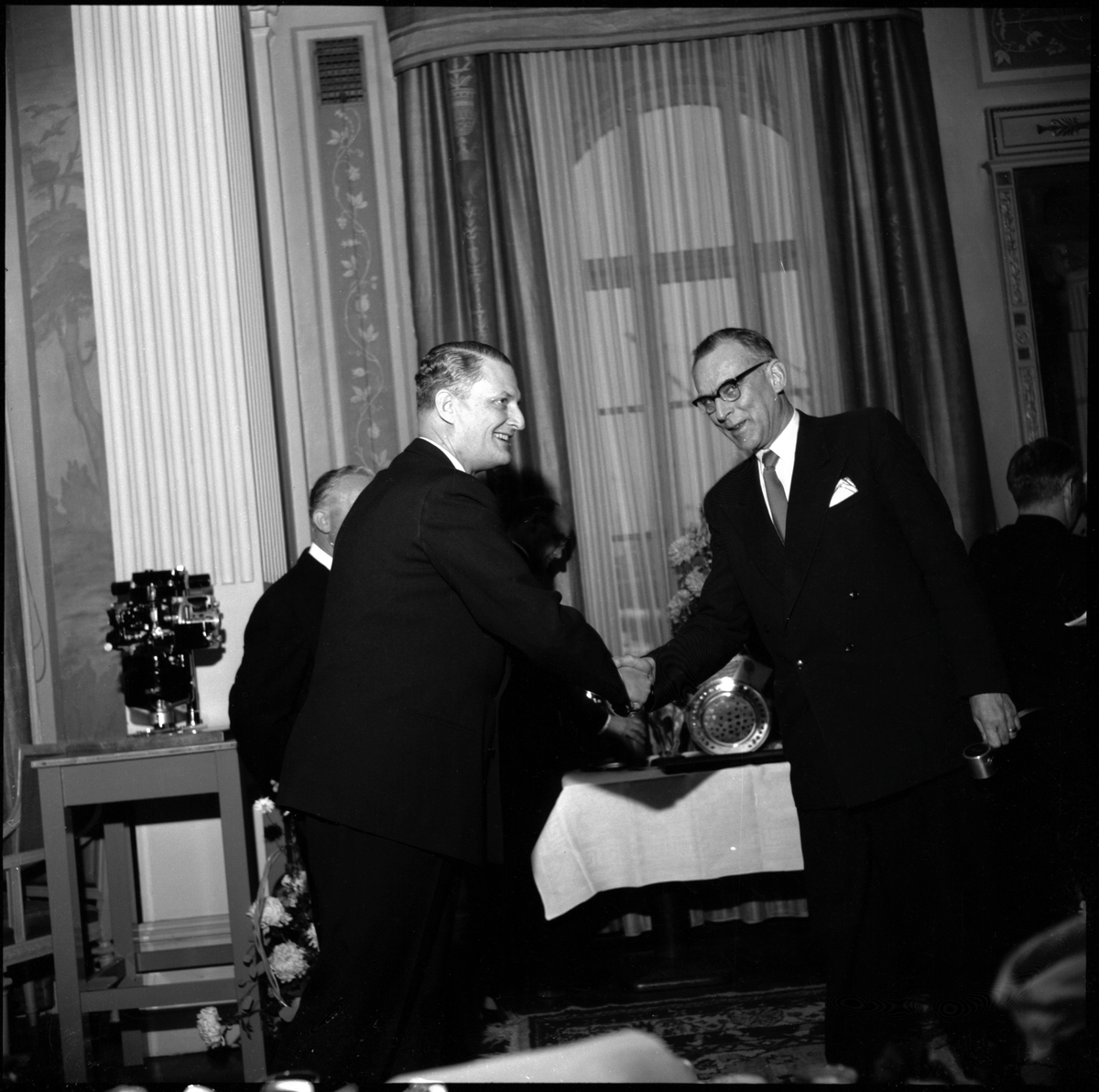 Titel: Generaldirektör Erik Upmark tar emot gåvor från Telestyrelsen, Generalpostst NKLJ, NBJ, SJBF, SVJM, KPF, Haeggströms Boktr.