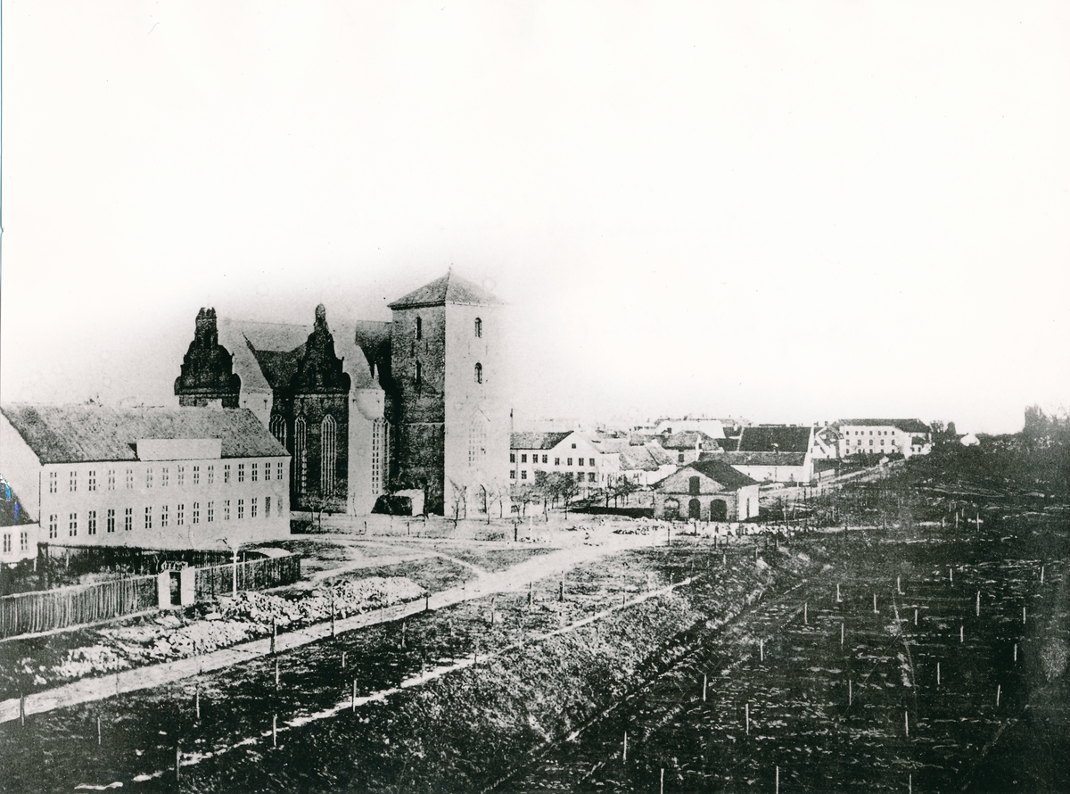 Kristianstad - Hässleholms Järnväg, CHJ Kyrkan och Hertig Karls skola (Hotell Brissman) före 1866. Fotot visar stakningen av den blivande bangården.