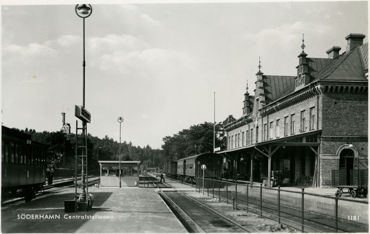 Till vänster en Statens Järnvägar, SJ C3a och de två vagnarna till höger så kallade "lejonburar" litt SJ C4. Bakom kiosken skymtar en gasvagn SJ Q4 från vilket leder en slang över spåren till C4-vagnarna. En av dessa får vid tillfället oljegas till belysningen påfyllt från Q4-vagnen.