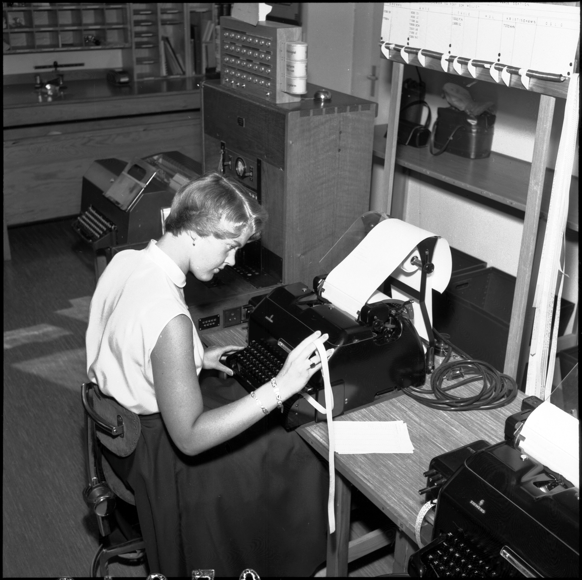 Kvinna i arbete med telexanläggning på Centralstation i Stockholm.